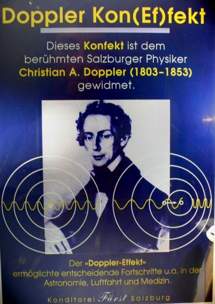 In addition to Mozart, Salzburg was the birthplace of the physicist Doppler. His birthplace has a small plaque on the wall, and the local Natural History Museum has a nice display of his work and applications of the Doppler effect. Since Austrians seem obsessed with chocolate, and tourists will buy anything, chocolate Mozart balls complete with chocolate Doppler candies. Furst is the name of the most famous candy maker in Salzburg, originators of the ridiculously expensive "original" Mozart balls (apparently, still hand-made). Being a tourist and a physicist, however, I could not resist buying a few of the Doppler chocolates. (The Natural History Museum had only a small mineral display, but a more interesting exhibit on the human body on the top floor.)
