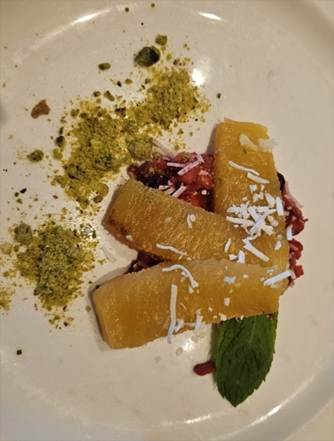 dinner menu one evening shows the variety of the appetizers and main courses.