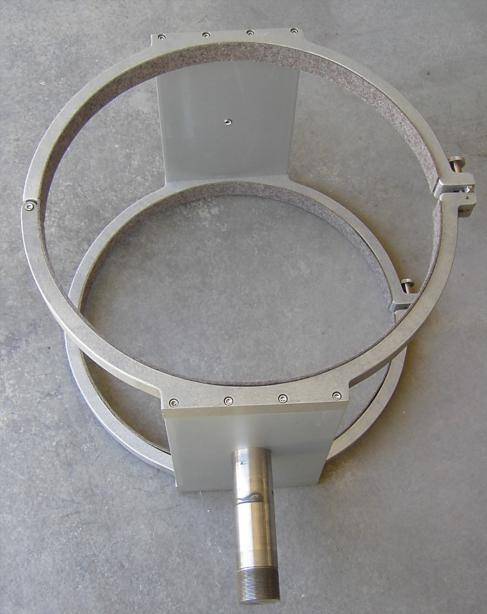Parallax Instruments mounting rings, modified with side mounting plates. 2" stainless steel shafts with threaded end are for clutch adjustment. One more bar was added (on the right side) to support the radial counterweight.