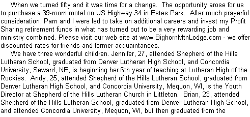 I have directed the Adult Handbell Choir for the past 19 years at Shepherd of the Hills Lutheran Church in Littleton (with my wife, Pam and daughter, Jennifer ringing). I have also served on the LVR Board of Directors working to support and promote the Family Ministry of Lutheran Valley Retreat of the last 10-plus years. Our family has enjoyed many years of camping at LVR. I spend the rest of my time as a full-time independent consultant/contract programmer for the Kroger Company.