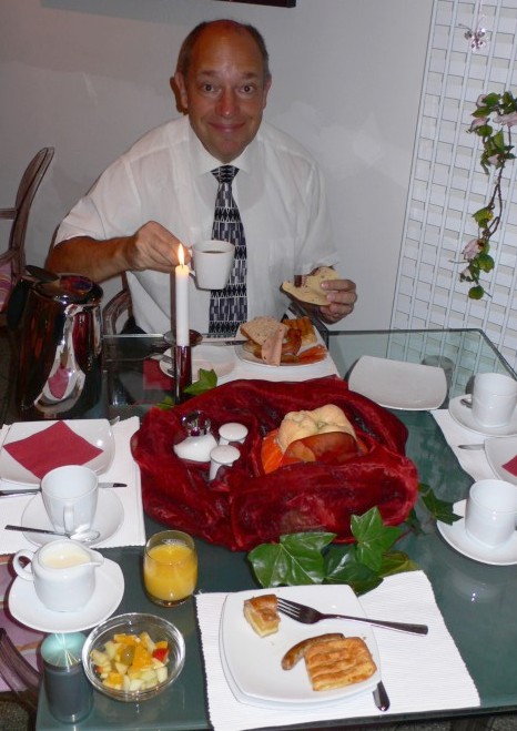 Breakfast in the hotel formed a little nicer memory - a typical all-you-can-eat buffet, including sausages, pastries, and fruit. I tried to not eat too much, saving room for snacks later in the day, but Jerry saw things a little differently...