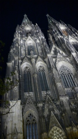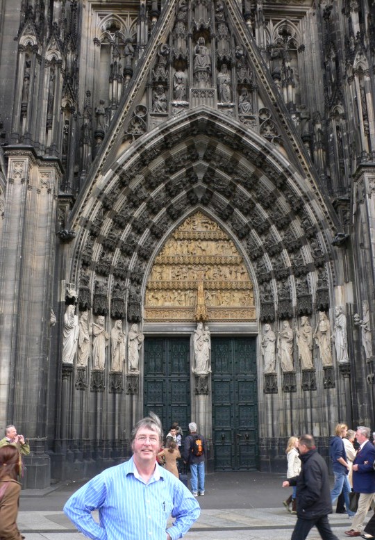 Köln! One of the largest cathedrals in the world. It is situated right between the train station and the main shopping center, so it gets a lot of foot traffic. Lots of tourists were around to ask help in taking my picture. Still no rain - a little cool breeze; perfect weather for traveling. It was impossible to get the entire cathedral in a picture that includes a single person, so I had the guy take my picture just in front of the main door. Note all the detail and sculptures. When the place was built, everything was white, so it must have been even more impressive.