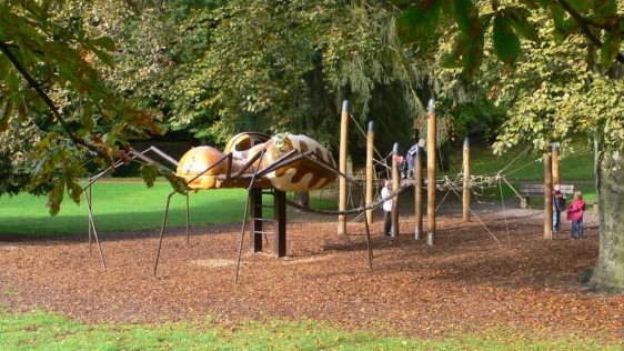 Between the main city parking lot and the Cathedral is a small park, perfectly placed so that kids can get out and play after a car trip. I really liked this giant spider, with the webbing coming out its backside forming a netting for the kids to play on. Inside the spider, its anatomy is painted in detail, so you can see all its major internal organs.
