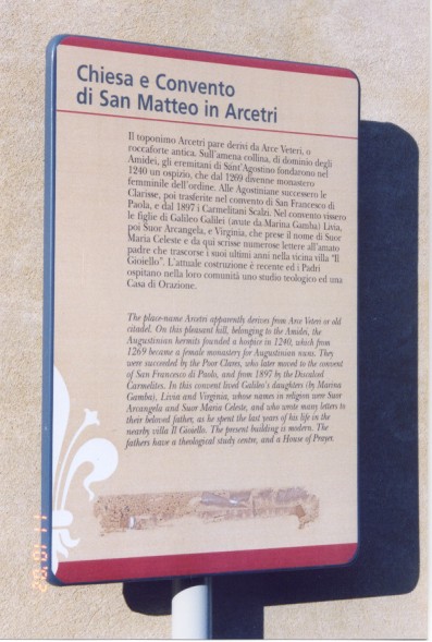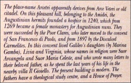 Jeralyn, Ruth, Ken, and I were escorted by Piero Salinari into Galileo's home "Villa il Gioiello" (The Jewel), so named because of its wonderful location overlooking Florence. Galileo lived here under house arrest for about 10 years after his trial with the Inquisition in Rome early in the 17th century. His daughters lived in the Convent of San Matteo, only a short walk from his home. "Galileo's Daughter", a recent book by Dava Sobel, gives lots of details on the area, and reading it was good preparation for the tour.