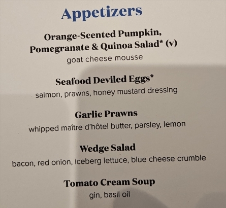 dinner menu one evening shows the variety of the appetizers and main courses.