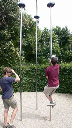 Another maze had some challenges, including a math puzzle (that no one could solve until a few days later) and a set of climbing poles. Michael and Evan both tried to reach the height needed to ring the bell, but it was too slippery for them. Click on the photo below for a video of Evan's best attempt. [its a 16MB file download].