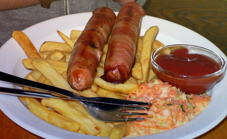 I think this was Evan's meal the first night; bacon-wrapped sausages!