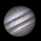 Seeing was below average, since the planet was so low on the horizon (36 degrees). A series of 2000 frames were taken over 200 seconds, resulting in a shift of about 0.7 arcsec at the equator on the meridian. This would be a little too long for the highest resolution (100 seconds results in 0.4 arcsecond motion, or about 0.2 arcsec smear), but since the seeing did not support high quality, the longer series was used to help select the best frames. At this gain, Io was not visible, since the webcam clips low level signals. The raw sum showed no features, and a very strong unsharp mask was required to bring out the clouds. When the planet rises earlier and the seeing is better, the webcam should perform well. If the 2x Barlow is added, a 100 msec exposure with 50% gain is needed, which should raise the background noise enough to see the moons.