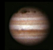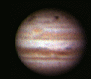 Jupiter at 4:27 UT on July 25, 1994; a 25 second exposure. The Great Red Spot is visible, for a good size comparison. Jupiter's central meridian was nearly the same as for the June 19 photos, which makes a good before-and-after comparison. Note the bright blue clouds near the center, making interesting contrasts.