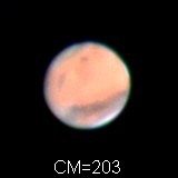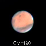 Central meridian = 194. Same exposure as before; 1 second in each color. Compare the detail and Mars diameter with about the same CM on June 20, 2001, shown above.